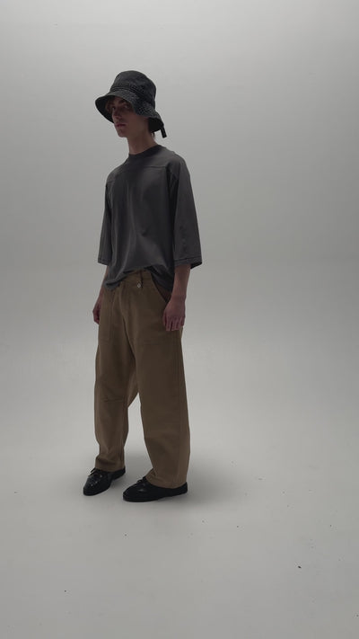 Boxed fit, wide chest, 2/3 sleeve + slightly cropped length